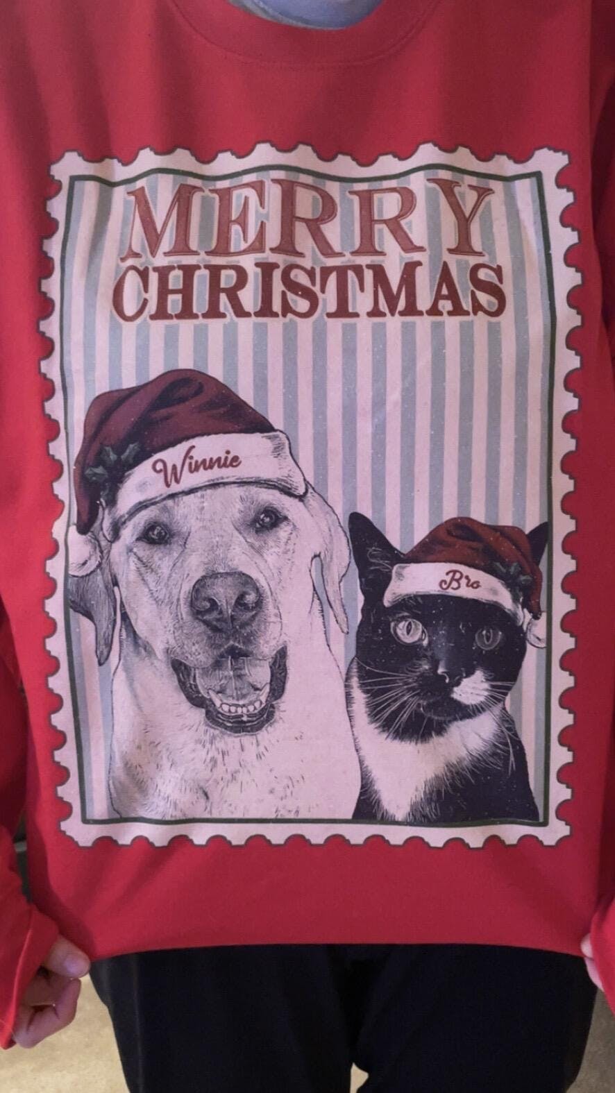 I LOVE this sweatshirt! This is a gift for Christmas. This is my third to purchase as a gift because my family loves them so much! The artwork is so spot on to the photos I send in! I will be buying more in the future!